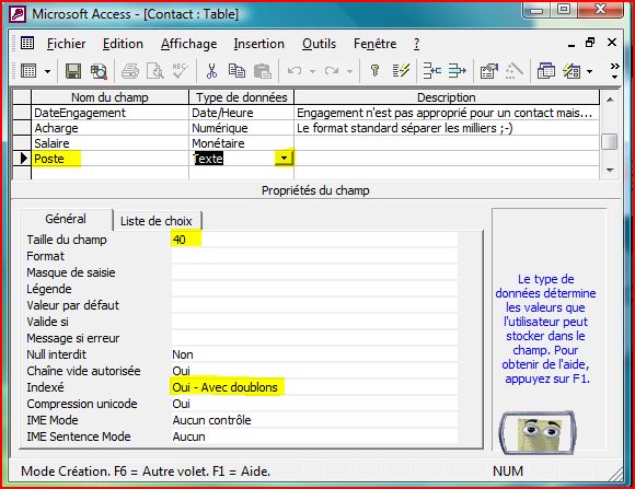 - Taille du champ : 50 caractères au maximum (Access n'utilise que les caractères encodés). 50 semble une valeur suffisante mais chacun son point de vue. - Format : il s'agit de la manière dont l'information sera présentée après la saisie. ">" ici signifie que lorsqu'on sort du champ nom, il est présenté en Majuscules quelque soit la manière dont il a été saisi. - Légende : Il s'agit d'une légende qui se mettre à la place du nom du champ. Cette propriété permet d'utiliser des abréviations dans les noms des champs sans perturber la personne qui encode - Null interdit : Cette propriété a, en général, la valeur "Non". Mais, il ne semble pas correct d'encoder une personne dont on ne connaîtrait pas le nom de famille. En mettant cette propriété à Oui, on oblige la personne a saisir au moins 1 caractère dans ce champ - Chaîne vide autorisée : Elle est directement en relation avec la propriété "Null interdit". Si on oblige qu'un contenu soit saisi dans le champ est-ce qu'on accepte que ce soit un espace ? (pour un nom de famille ça n'est pas envisageable). - Indexé : Ce champ sera-t-il très utilisé pour les filtres, les tris, les recherches ? Si c'est le cas, nous gagnerons en efficacité en indexant le champ (dans un monde papier, on collait des cavaliers de couleurs sur les fiches pour repérer plus rapidement certaines informations). ATTENTION, il faut ici un index "Oui - AVEC doublons" car il peut y avoir plusieurs contacts ayant le même nom (mais bien sur avec des prénoms différents => à suivre) |