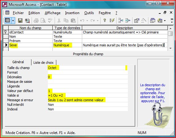 | 9 | Explications sur les propriétés du champs Sexe. N'oubliez pas l'aide |